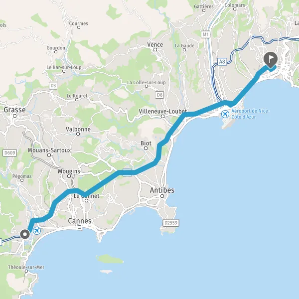 Avec le mode voiture, vous pouvez configurer vos options (type de véhicule, autoroute ou non, péage ou non, distance la plus courte), tout en ayant accès aux infos de circulation grâce à notre service d'info-trafic en temps réel. Ainsi faites des économies sur le coût ou la durée de votre voyage, en trouvant le trajet Mandelieu-la-Napoule Nice adapté à vos besoins.