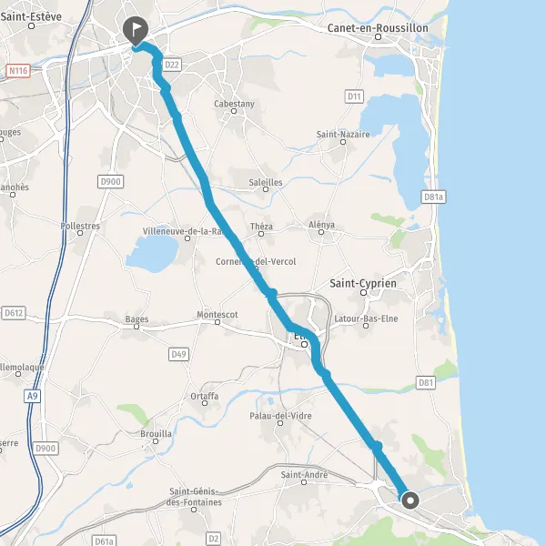 Au rond-point, prendre la 1ère sortie sur D22c (Route d'Elne) et continuer sur 900 mètres