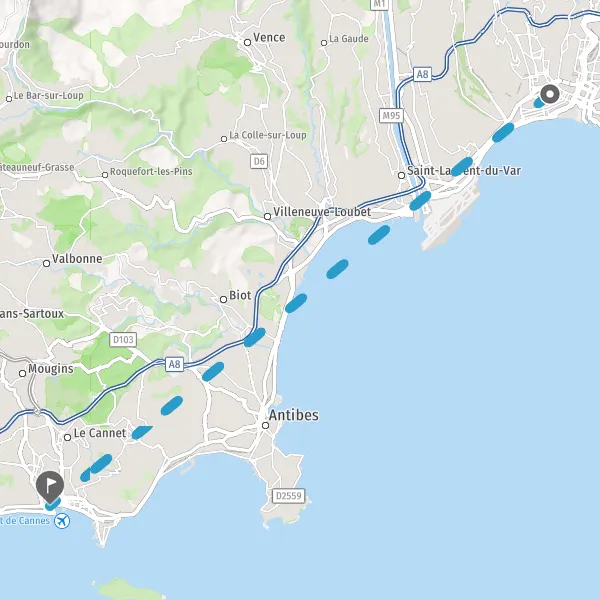Ne perdez plus votre temps à chercher un vol pas cher, Mappy vous permet de comparer tous les prix et les horaires pour réserver votre billet d'avion de Nice à Cannes. Vous pouvez également comparer votre trajet Nice Cannes en avion, entre différentes compagnies (AirFrance, Easyjet, etc..) ou avec les autres modes de transports et calculer ainsi les économies de temps ou de coût réalisées.