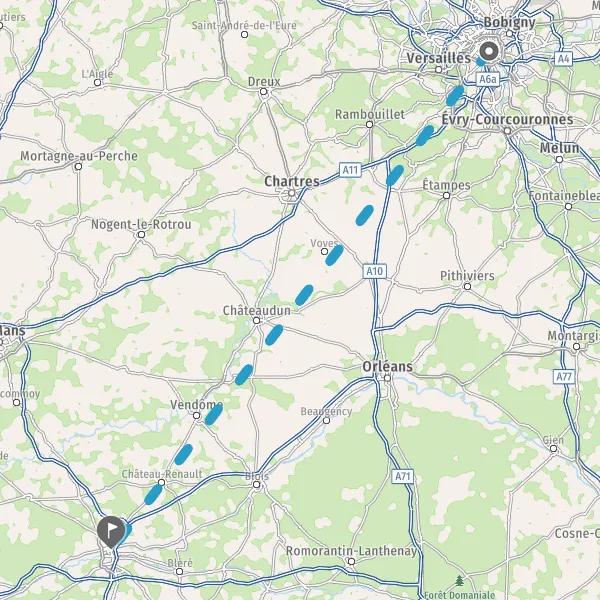 Venir à Tours. En voiture : 3 autoroutes desservent la Touraine : l’A10 (entre Paris et Bordeaux), l’A28 (entre Rouen et Tours) et l’A85 (entre Nantes et Bourges). Voici quelques indications de distances pour rallier Tours : Nantes (222 km), Paris (238 km), Rennes (242 km), Rouen (274 km), Bordeaux (348 km), Dijon (419 km), Lille (460 km), Lyon (463 km), Toulouse (525 km), Montpellier (664 km), Marseille (798 km), Nice (955 km). En autocar : la ville de Tours est desservie par autocar via les compagnies BlaBlaCar et ou Flixbus. En train : comptez 1h de TGV pour faire le trajet entre la gare de Paris Montparnasse et la gare de Tours / Saint-Pierre-des-Corps. D’autres liaisons directes sont proposées avec l’Ile-de-France : Massy (aéroport d’Orly), Marne-la-Vallée (Disneyland) et l’aéroport Roissy-Charles de Gaulle.Se déplacer à Tours : en vélo avec Velociti (service de location de vélo longue durée) ou avec Indigo Weel (vélos en libre-service), en transports en commun (la ville de Tours est desservie par le service de tram et bus de l'agglomération ""Fil bleu"" et le réseau départemental ""Fil vert""), en covoiturage avec covoiturons-en-touraine.com , en autopartage avec Citiz Tours (service de location de voiture en libre-service de courte durée), en taxi ou à pied.