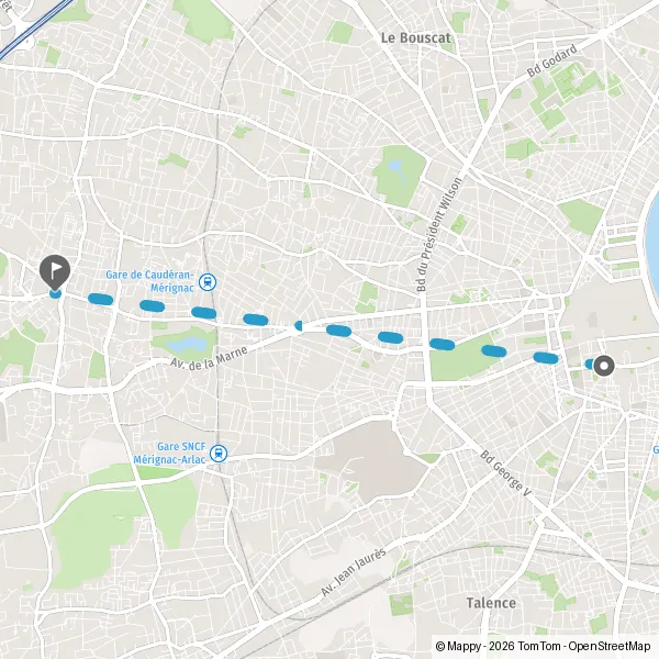 Itinéraire en autocar de Bordeaux 33000-33800 Nouvelle-Aquitaine (France) à Mérignac 33700 Nouvelle-Aquitaine (France)
