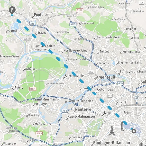 Venir à Pontoise. En train : Pontoise se situe à 30 km au nord-ouest de Paris. On peut s’y rendre par le train à partir de Paris par la gare du Nord ou la gare Saint-Lazare, et depuis 2000 par le RER C dont le terminus est à Pontoise. En voiture : par la route, Pontoise est au croisement de l’autoroute A15, prolongée en direction de Rouen par la RD14, et de la Francilienne (rocade de l’Île de France) qui permet de rejoindre l’A16, l’A1 et l’aéroport Roissy Charles-de-Gaulle au nord, l’A14, Saint-Germain-en-Laye et Versailles au sud. Par avion, l’aéroport international Roissy Charles-de-Gaulle est à une demi-heure de Pontoise par la Francilienne.sSe déplacer à Pontoise : en voiture, en bus avec le réseaux Stivo et Busvaldoise, en vélo ou à pied.