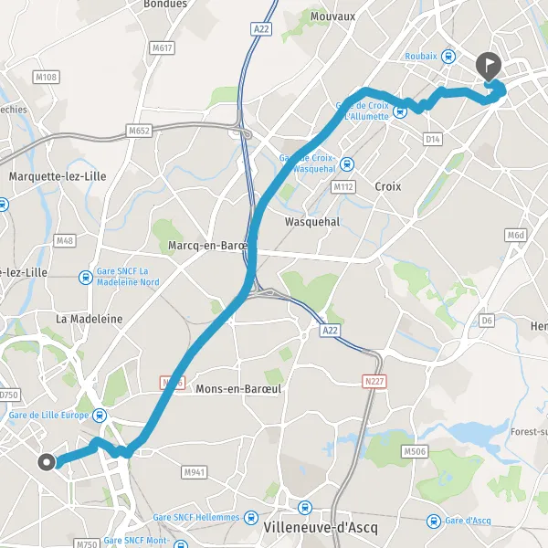 Venir à Roubaix. En voiture : Roubaix est directement raccordée aux grandes infrastructures autoroutières (A1, A22 et A25) par des voies rapides : la voie rapide urbaine (N356) dessert le centre ville et les quartiers nord, son prolongement appelé la « Route de la Laine » assure la liaison avec la Belgique par les autoroutes A17 (Tournai, Courtrai, Bruges à l’est) et A27 (Lille-Bruxelles au sud) et l’antenne sud (RD700) dessert les quartiers Sud et Est de la Ville. En train : la gare de Roubaix, située sur une ligne transfrontalière, est reliée à la ville de Lille mais aussi à la Belgique : Courtrai, Gand, Anvers et Ostende, par de nombreux trains journaliers. Se déplacer à Roubaix : en transports en commun (métro, tramway et bus),sen vélo (près de 40 kms de voies équipées de bandes cyclables), en vélo libre service avec V'Lille (32 stations réparties dans la ville), en voiture ou à pied.