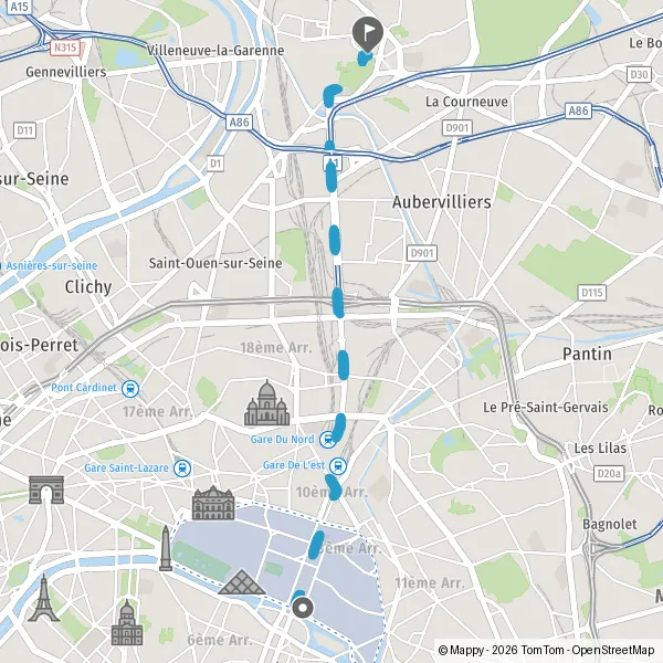 Tourner légèrement à droite sur D931 (Avenue de la Porte de la Chapelle) et continuer sur 3,3 kilomètres