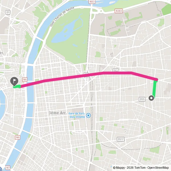 | Distance en transports en commun | 4,3 km à 4,4 km |