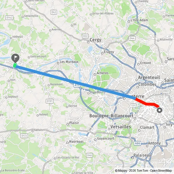 | Distance en transports en commun | 50 km à 52 km |