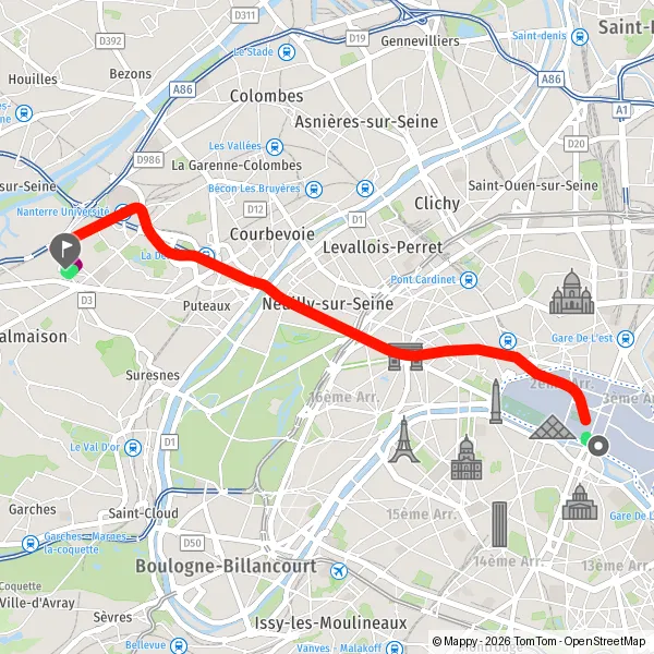 | Distance en transports en commun | 12,8 km à 13,2 km |