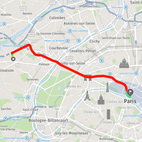 | Distance en transports en commun | 13,0 km à 13,4 km |