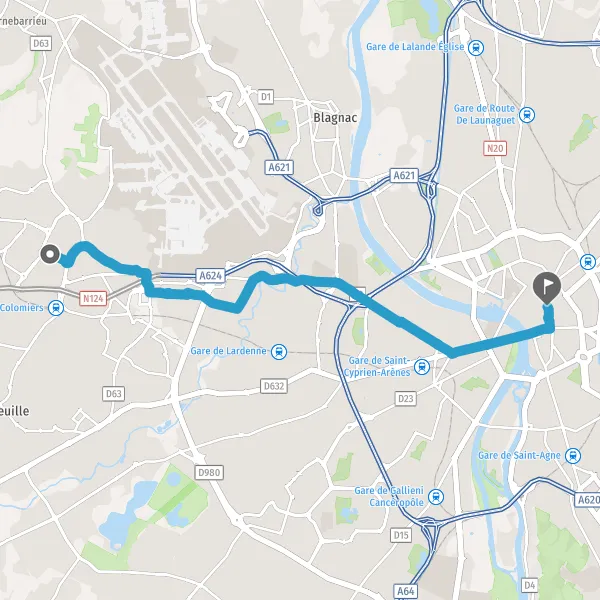 Prendre légèrement à droite la piste cyclable Route de Bayonne et continuer sur 20 mètres
