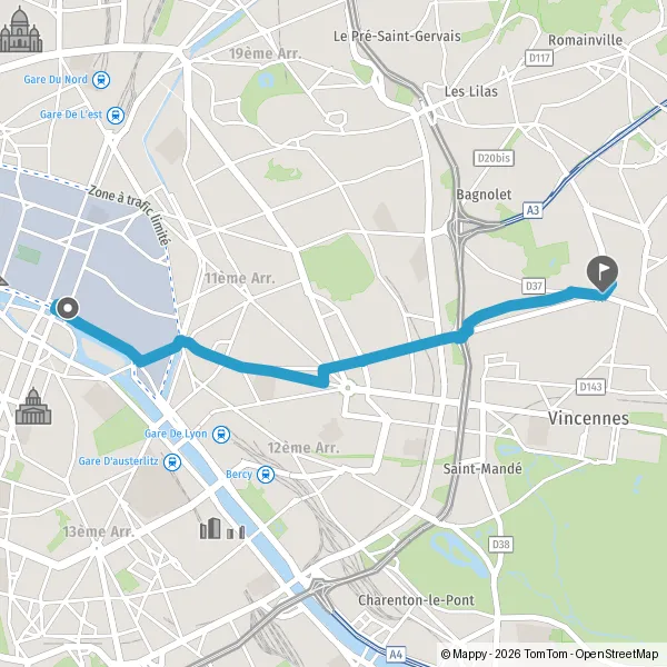 Prendre à gauche la piste cyclable Rue du Faubourg Saint-Antoine et continuer sur 1,7 kilomètre