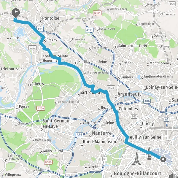 Au rond-point, prendre la 2ème sortie la piste cyclable Boulevard de l'Oise et continuer sur 1,3 kilomètre