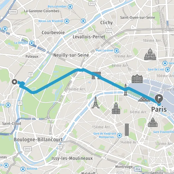 Prendre légèrement à droite la piste cyclable Route de Suresnes et continuer sur 350 mètres