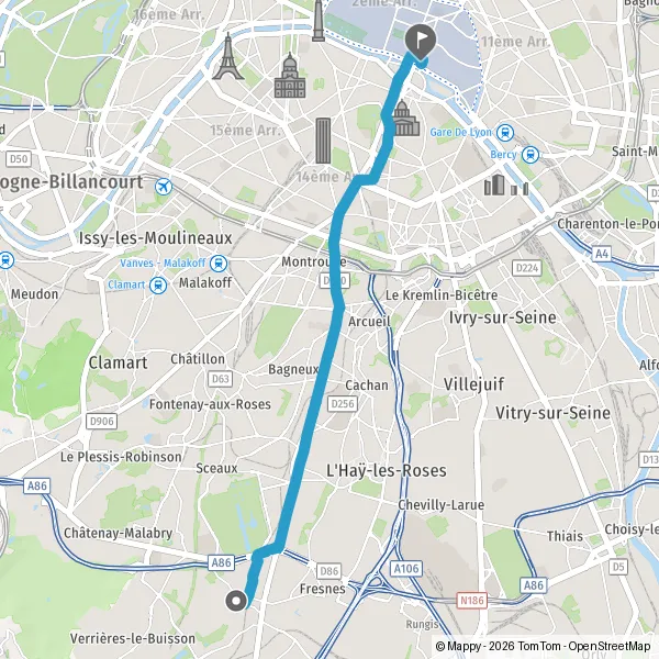 Prendre à gauche la piste cyclable Rue du Faubourg Saint-Jacques et continuer sur 1,2 kilomètre