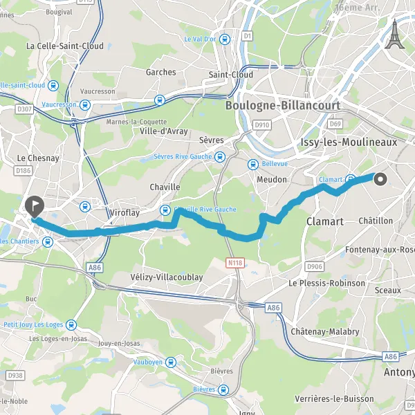 Au rond-point, prendre la 4ème sortie la piste cyclable Route du Pavé de Meudon et continuer sur 1,5 kilomètre